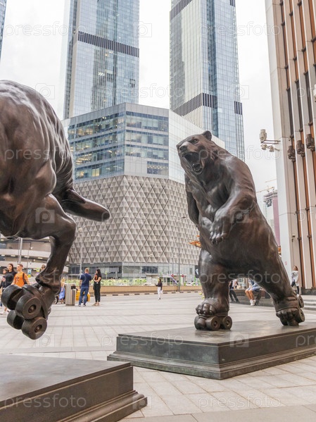 Москва, Россия - 07.07.2023 - Скульптура быка и медведя в деловом районе города, известного как Москва-Сити. Рынки