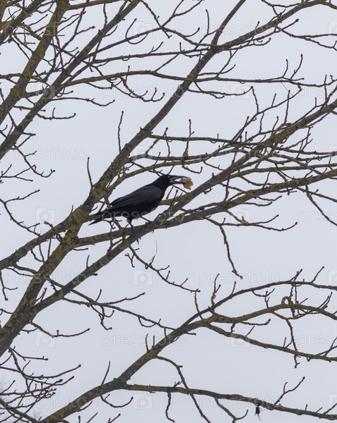 Крупный план ворона с костью в клюве в зимний день. Концепция