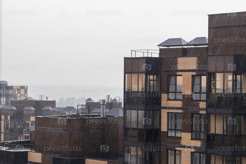 Крупный план современного жилого района в дождливый день. Город
