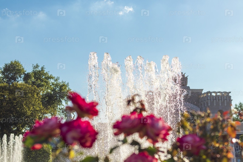 Снимок фонтана с красными цветами на переднем плане. Концепция
