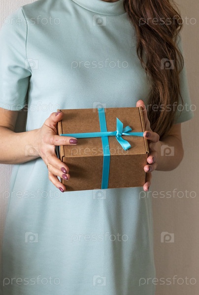 Крупный план женщины, держащей завернутую подарочную коробку. Праздничный день