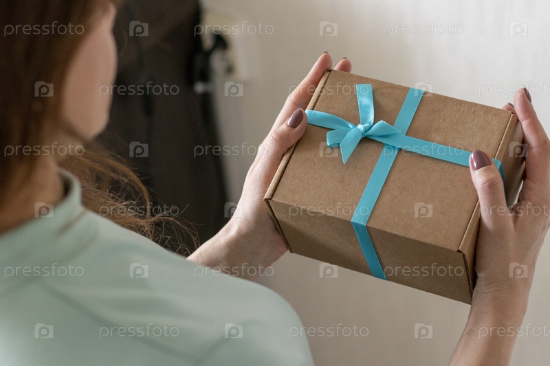 Крупный план женщины, держащей завернутую подарочную коробку. Праздничный день