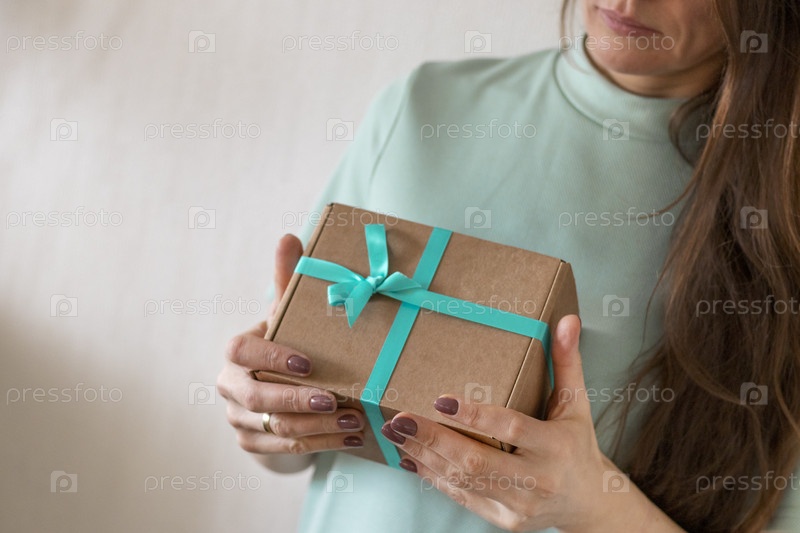 Крупный план женщины, держащей завернутую подарочную коробку. Праздничный день
