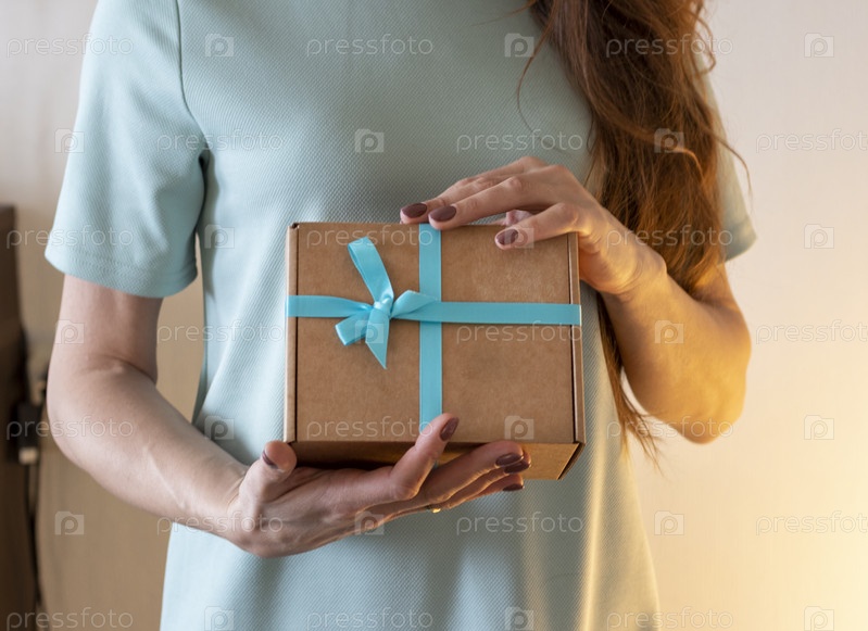 Крупный план женщины, держащей завернутую подарочную коробку. Праздничный день
