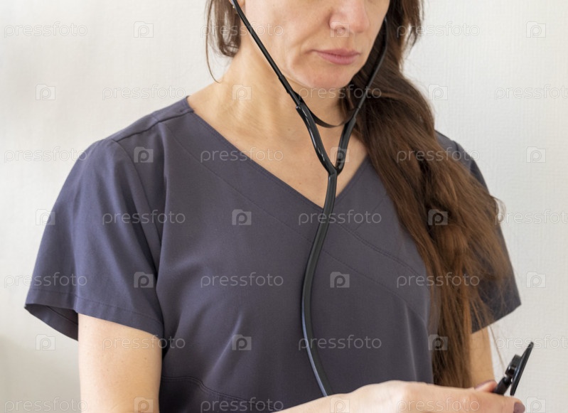 Снимок женщины-врача в форме на фоне белой стены. Здравоохранение