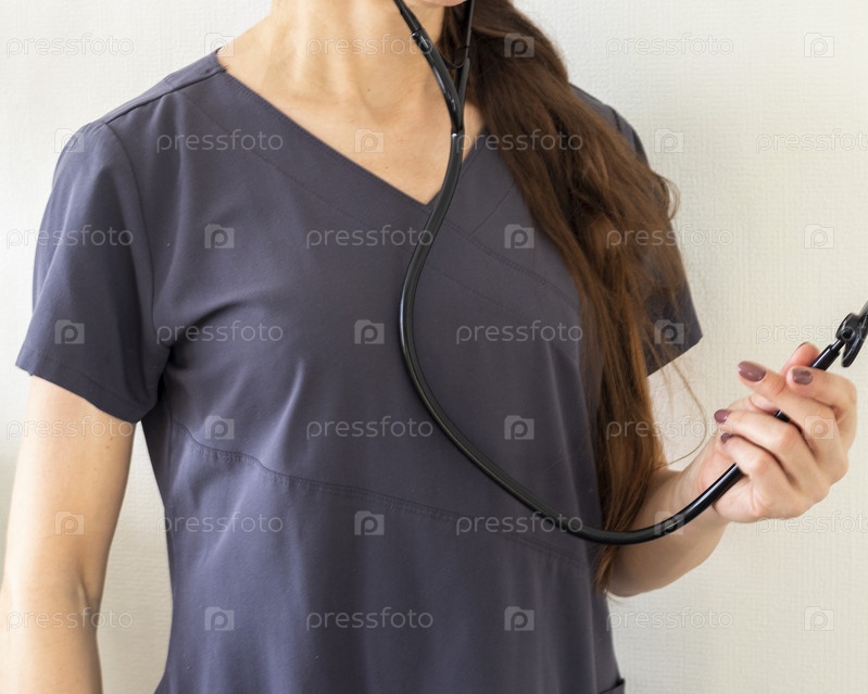 Снимок женщины-врача в форме на фоне белой стены. Здравоохранение