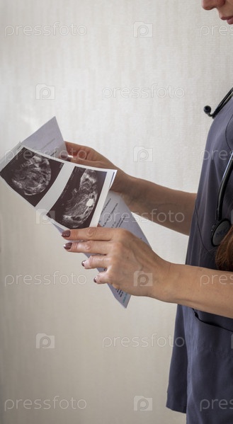 Снимок женщины-врача в форме на фоне белой стены, изучающей ультразвуковое изображение. Здравоохранение