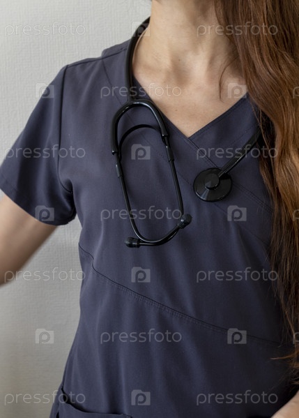 Снимок женщины-врача в форме на фоне белой стены. Здравоохранение