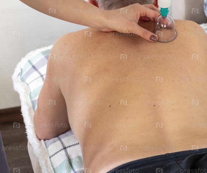 Снимок женщины-врача в униформе на фоне белой стены, осматривающей пациента мужского пола среднего возраста, выполняющей баночную терапию. Здравоохранение