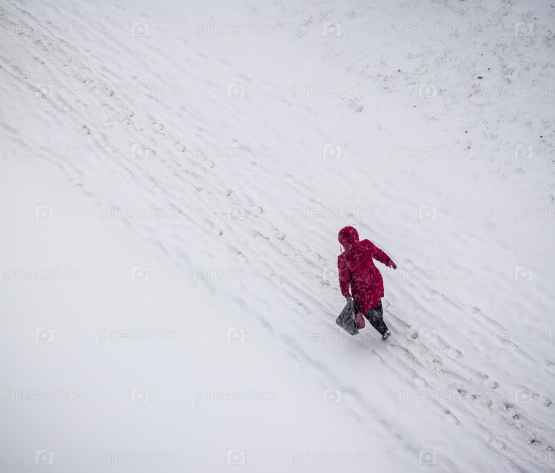 Фотография женщины в красном пальто, идущей по снегу. Время года