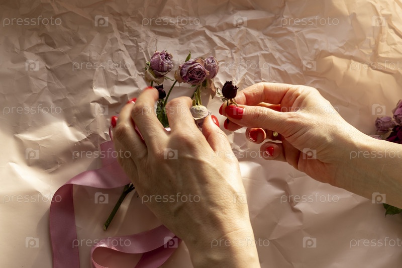 Концептуальный снимок фоновой темы, оберточной бумаги, сушеных роз, других цветов и других композиций. Украшение