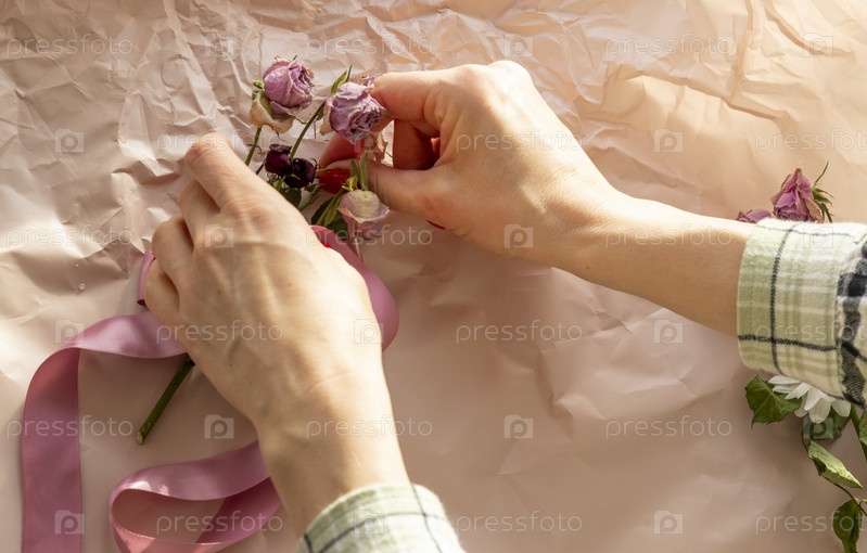 Концептуальный снимок фоновой темы, оберточной бумаги, сушеных роз, других цветов и других композиций. Украшение
