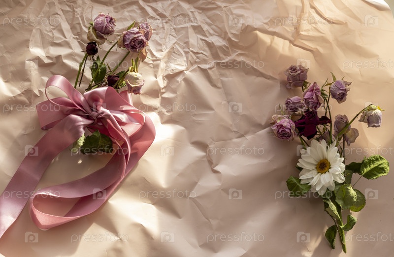 Концептуальный снимок фоновой темы, оберточной бумаги, сушеных роз, других цветов и других композиций. Украшение