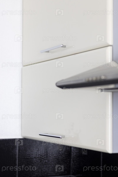 Крупным планом кухонные шкафы и электрическая вытяжка на кухне. Семья