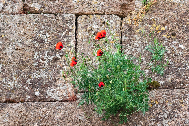 Стена старого замка с цветами мака, растущими в трещинах кладки