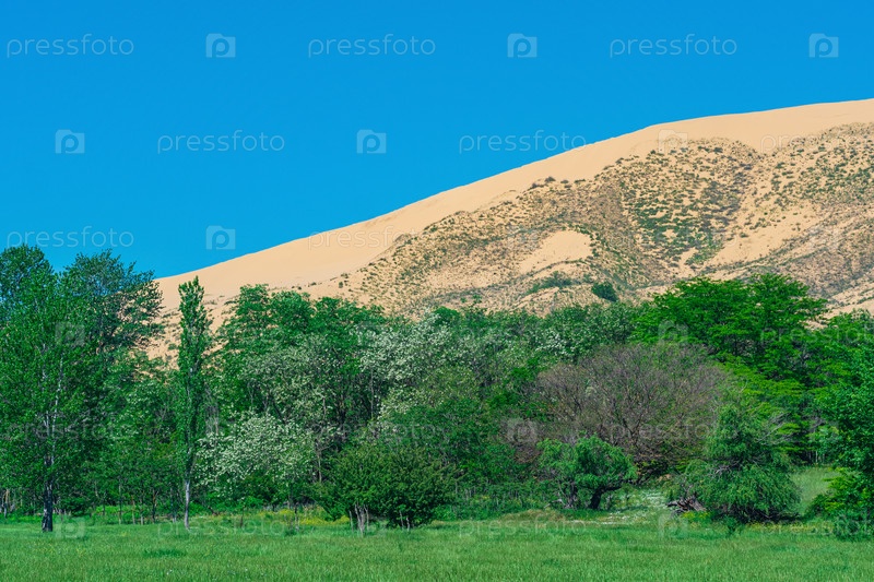 Зеленая цветущая долина с большой песчаной дюной на заднем плане