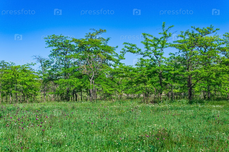 Весенний солнечный открытый лесной пейзаж с цветущим лугом и лиственными рощами