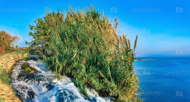 Природный ландшафт с тростником, растущим на краю водопада на скале над морем, Нижний Дюден, Анталья