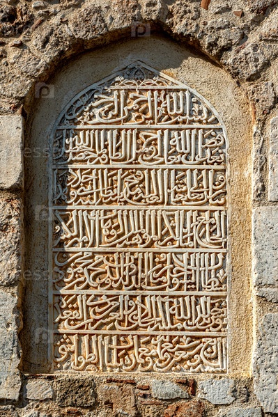 Каменная надпись арабской вязью на стене минарета Йивли в Анталии, рассказывающая о реконструкции мечети в 14 веке