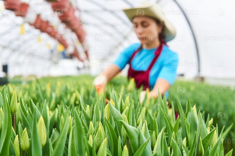 Молодая женщина ухаживает за тюльпанами в теплице, сосредоточьтесь на близлежащих растениях