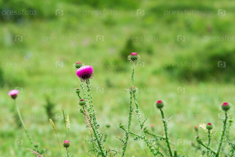 Красивый фиолетовый цветок чертополоха на фоне размытого весеннего пейзажа