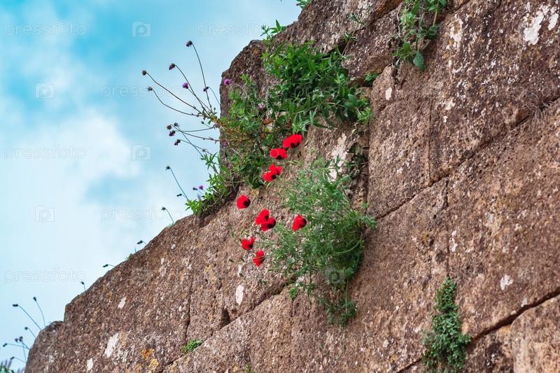 Руины стен старой крепости с цветами мака и чертополоха, растущими в трещинах кладки