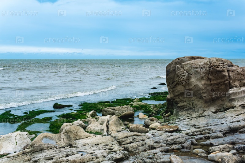 Побережье Каспийского моря с прибрежными скалами и камнями, покрытыми водорослями