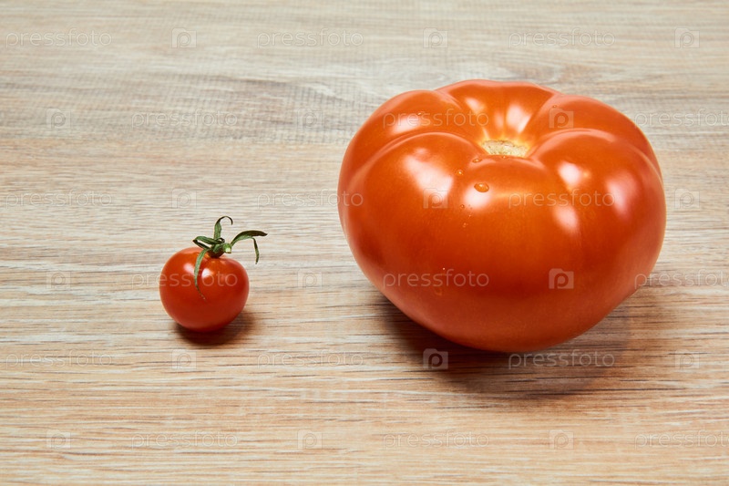 Маленький помидор черри рядом с большим помидором на столе