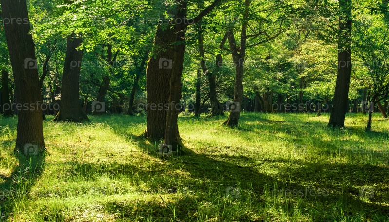 Пейзаж в дубовом лесу в солнечный день