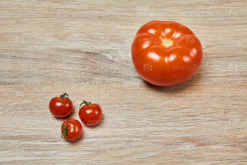 Три маленьких помидора черри рядом с большим помидором на столе