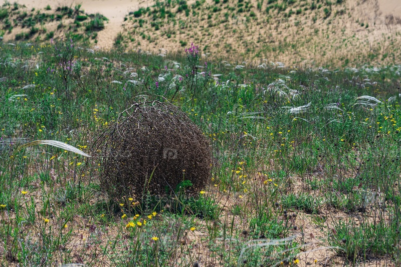 Перекати-поле катится по сухой ковыльной степи