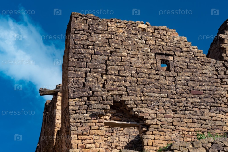 Руины каменных стен на фоне неба в древней заброшенной деревне Гамсутль