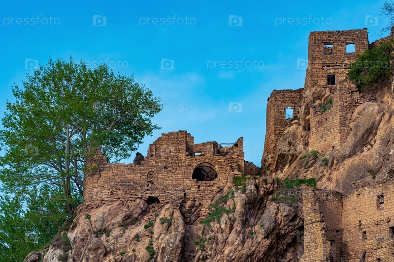 Руины стен домов на скале в заброшенной деревне Гамсутль