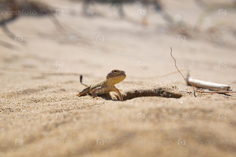 Портрет пустынной ящерицы секретной жабоголовой агамы возле ее норы