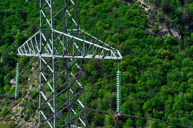 Фрагмент опоры ЛЭП крупным планом на фоне лесистого склона горы