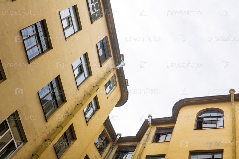 Вид на верхние этажи старинных построек из узкого и глубокого двора-колодца