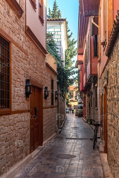 Велосипед припаркован в историческом узком переулке в Калеичи, историческом центре Антальи
