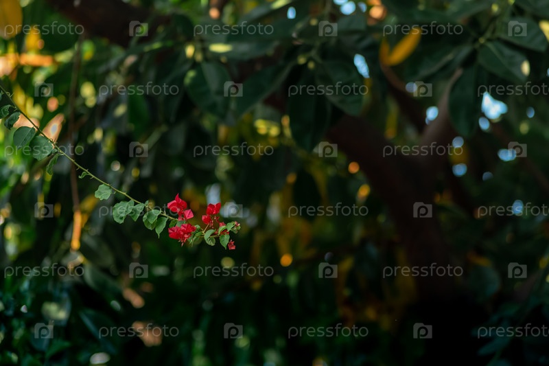Красные цветы вьющегося растения на фоне размытого тенистого тропического леса