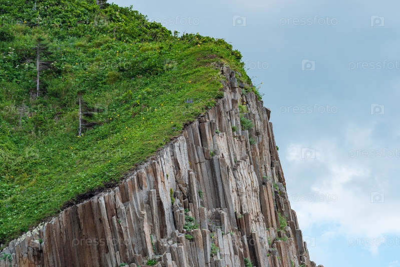Фрагмент скалы из столбчатого базальта с пышной травой сверху на фоне неба
