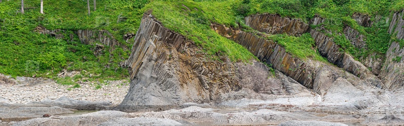 Панорама прибрежного ландшафта острова Кунашир у мыса Столбчатый со столбчатыми базальтовыми скалами, покрытыми растительностью