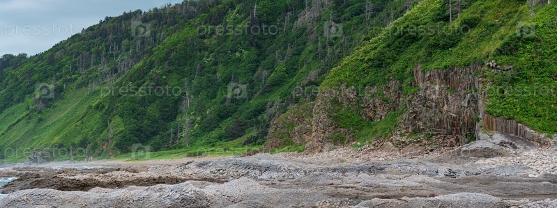 Прибрежный пейзаж, красивые лесистые скалы на зеленом побережье острова Кунашир