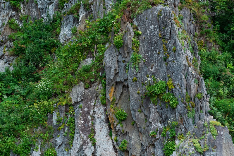 Отвесные базальтовые скалы, поросшие пышной растительностью