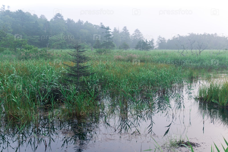 Утренний туманный природный ландшафт, болото с осокой среди леса