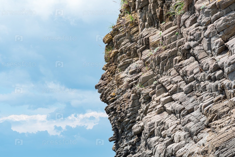 Старая потрескавшаяся базальтовая скала на фоне неба