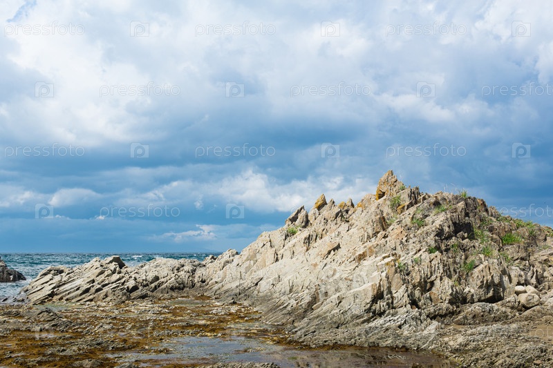 Берег океана со скалами столбчатого базальта, мыс Столбчатый на острове Кунашир