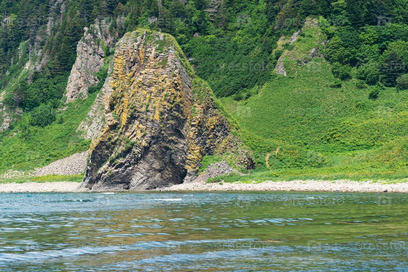 Прибрежный пейзаж, красивые лавовые скалы на зеленом побережье острова Кунашир