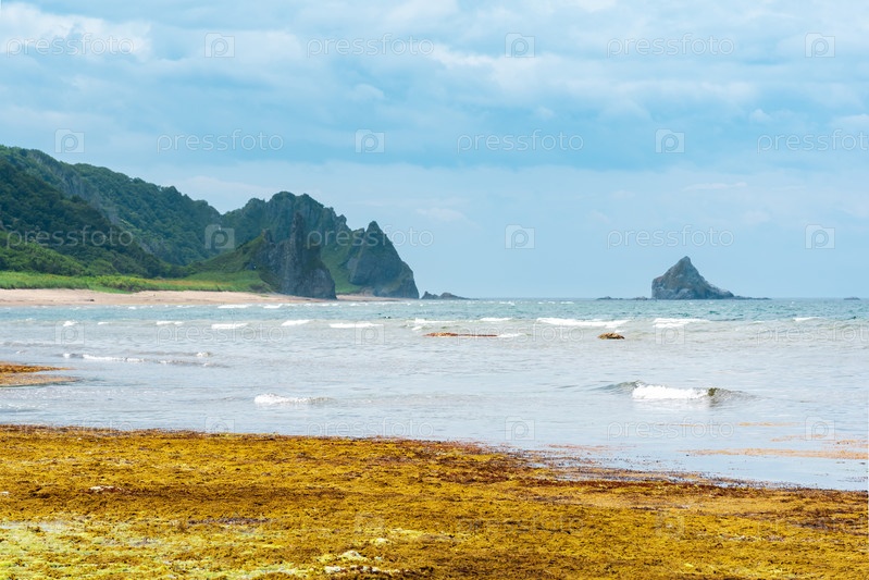 Водоросли на побережье во время отлива на фоне частично размытого морского пейзажа с прибрежными скалами