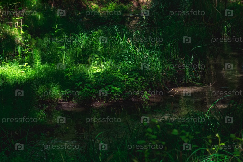 Небольшая тенистая лесная река с травянистыми берегами и солнечными бликами