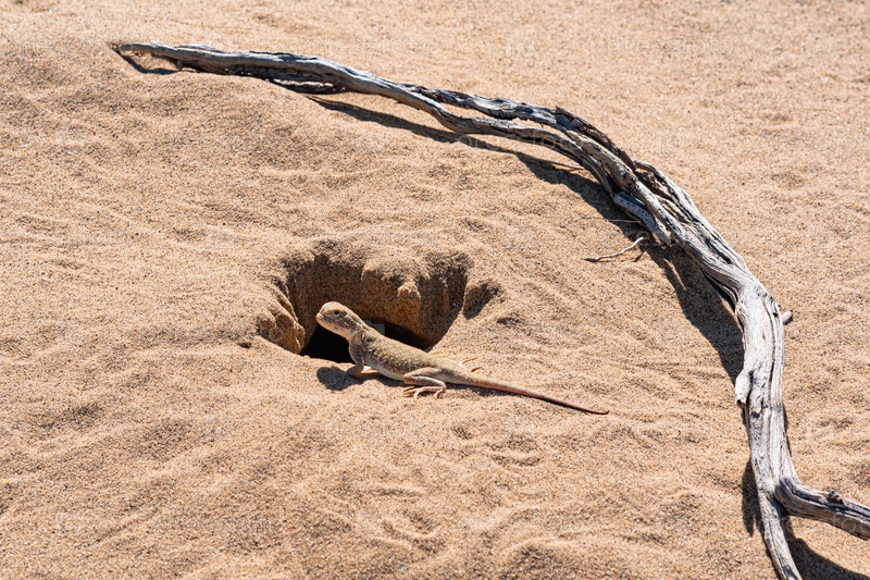Жабоголовая ящерица-агама возле своей норы в песке пустыни