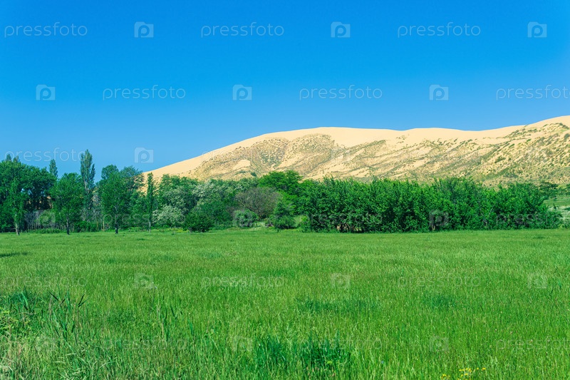 Зеленая цветущая долина с большой песчаной дюной на заднем плане